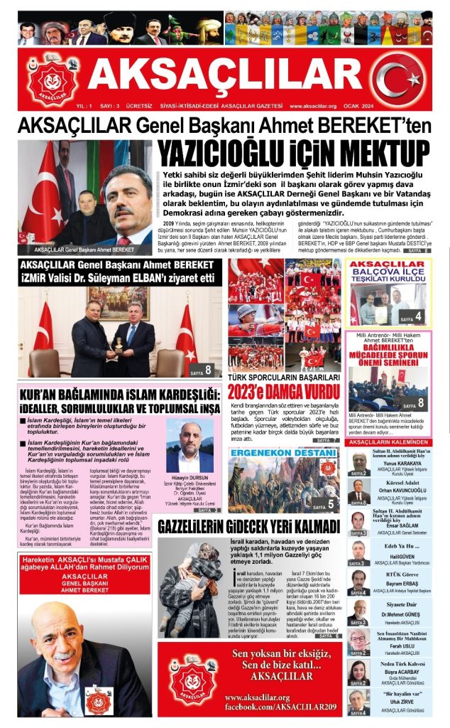 AKSAÇLILAR Gazetemizin 4 sayfa olarak yayınlanan aylık Gazetesi Budan sonra Ulusal ebat ve 8 sayfa olarak yayın hayatına devam edecek Ocak 2024 1 sayımız. Yorumlarımızı bekliyoruz